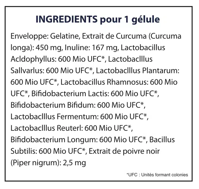 Préservez l'équilibre optimal des bonnes bactéries pour ne pas déséquilibrer votre système immunitaire. Notre formule rassemble 6 milliards de souches probiotiques associées au curcuma pour un système immunitaire sain et un bon équilibre des bactéries de la flore intestinale.
